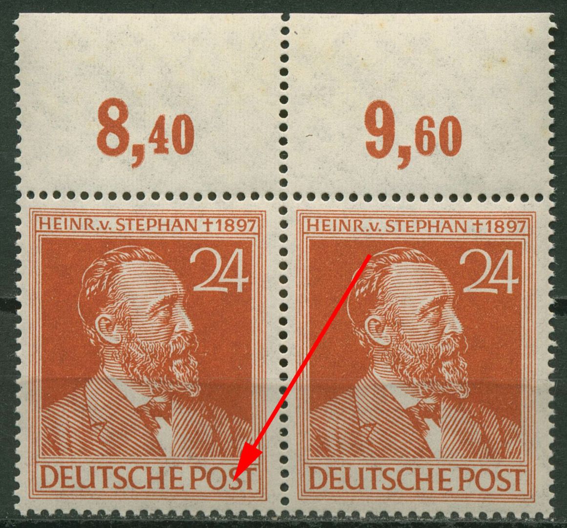 Plattenfehler II: unterer Bogen des S in POST beschädigt, Paar mit Vergleichsstück