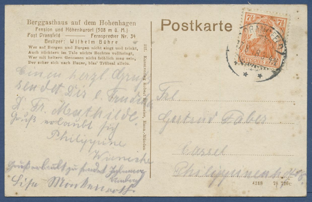 Berggasthaus auf dem Hohenhagen bei Dransfeld Besitzer Wilhelm Bühre, gelaufen 1918 (AK558)