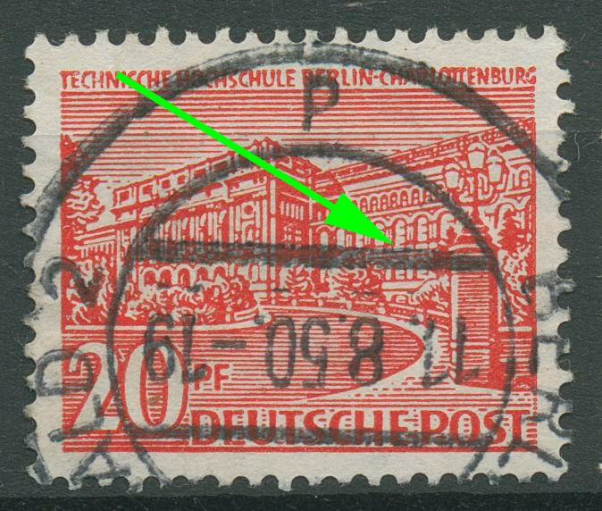 Plattenfehler 49 II: rechter Gebäudeteil, mittlere Fensterreihe, im Fenster unter H in CHARLOTTENBURG "E" mit 4 Querstrichen