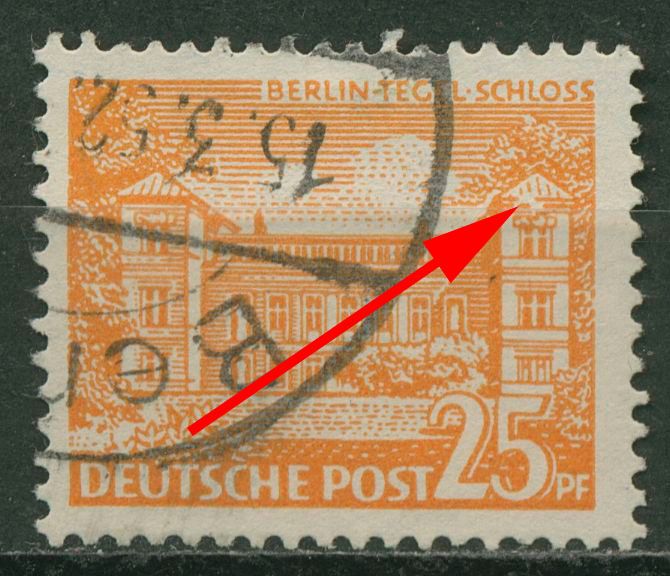 Plattenfehler 50 VIII: weißer Fleck im rechten Turm zwischen Dachschraffur und obersten Fenster