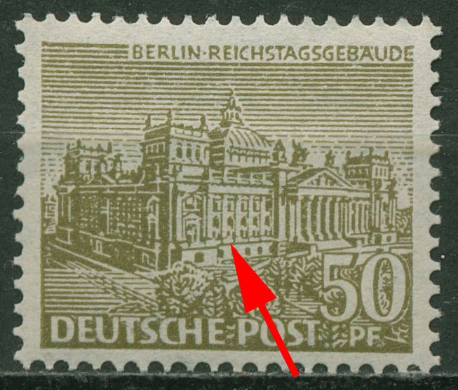Plattenfehler 53 II: Querstrich in unterster Fensterreihe über E P von DEUTSCHE POST fehlend