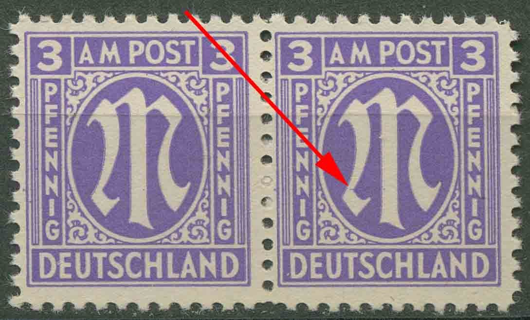 Plattenfehler 1 z f 34: waagerechter Farbstrich unten im linken Abstrich des M im Oval
