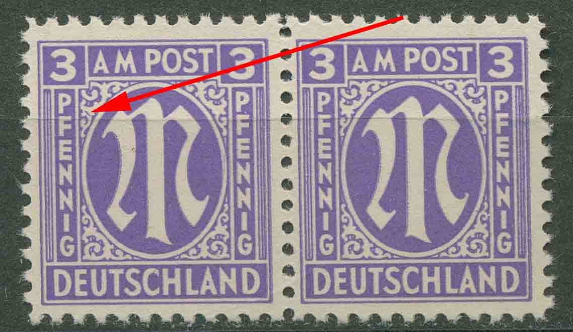 Plattenfehler 1 z f 84: Farbstrich im oberen linken Ornament neben P von PFENNIG