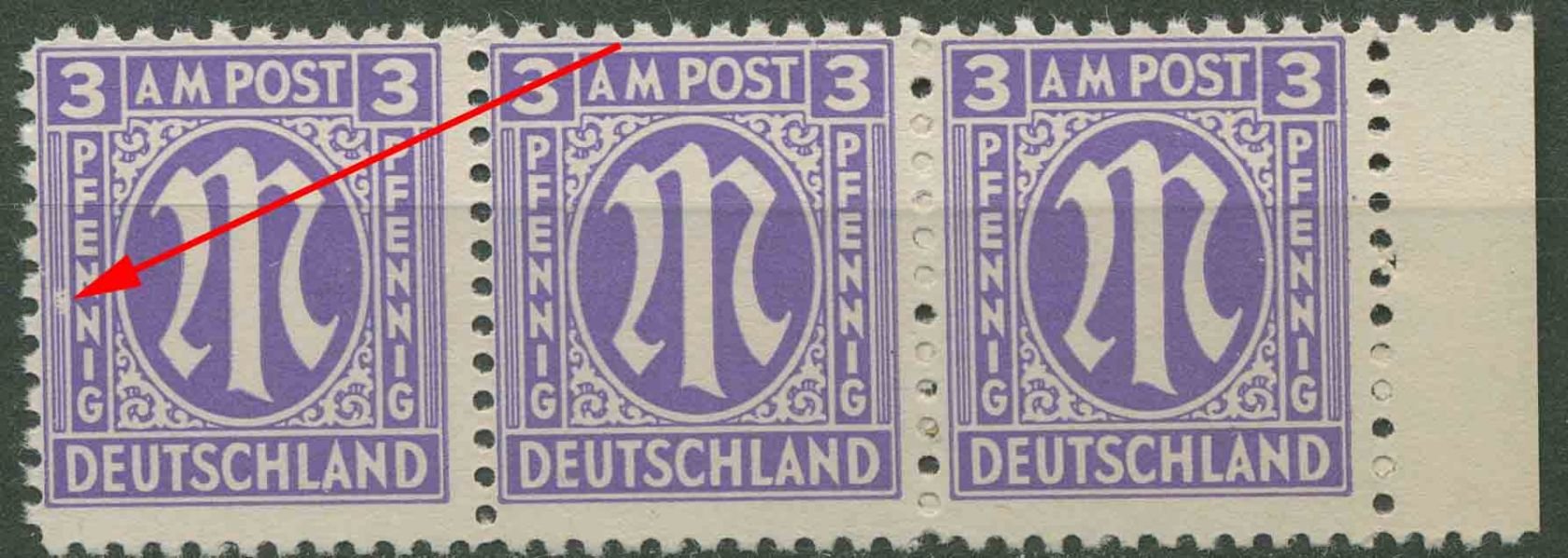 Plattenfehler 1 z I: linke Zierlinie neben NN in PFENNIG gebrochen