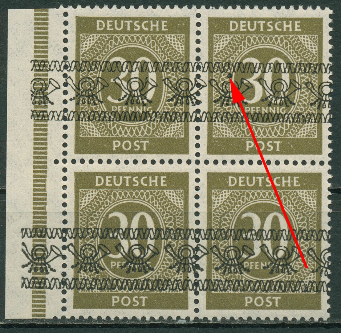 Aufdruckfehler 63 I AF O I: Punkt über der Posthornschleife, sog. Kasseler Punkt, Feld 42, im 4er-Block