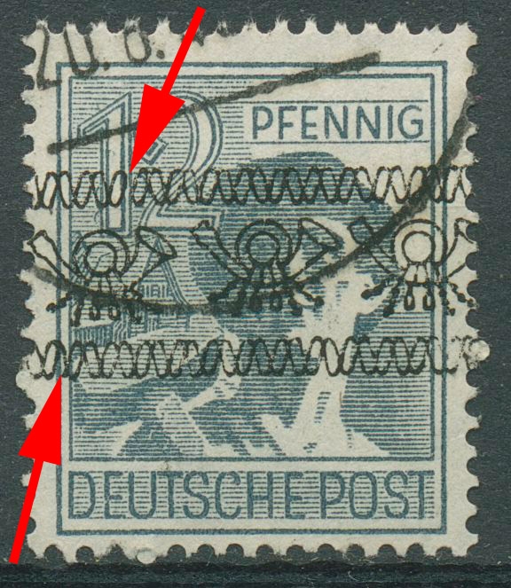 Aufdruckfehler 40 I AF PII: zwei Glieder in gleicher Richtung schräg nach rechts oben ausgerichtet, im oberen Zierband rechts über dem Posthorn ohne, im unteren Zierband links unter dem Posthorn mit Strich verbunden