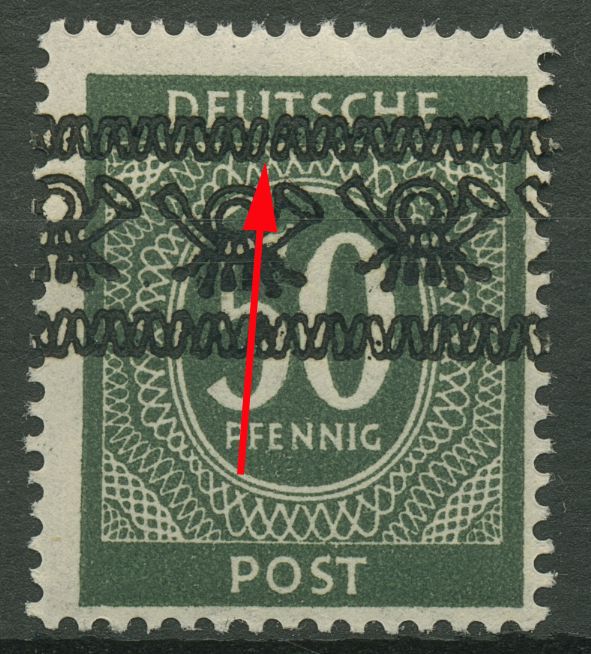 Aufdruckfehler 66 I a AF PII: zwei Glieder in gleicher Richtung schräg nach rechts oben ausgerichtet, im oberen Zierband rechts über dem Posthorn ohne (und im unteren Zierband links unter dem Posthorn mit Strich verbunden)