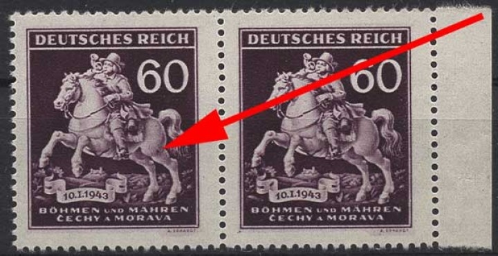 Böhmen & Mähren 113 postfrisch mit Plattenfehler IV, Plattenfehler IV: Punkt im Hinterbein des Pferdes