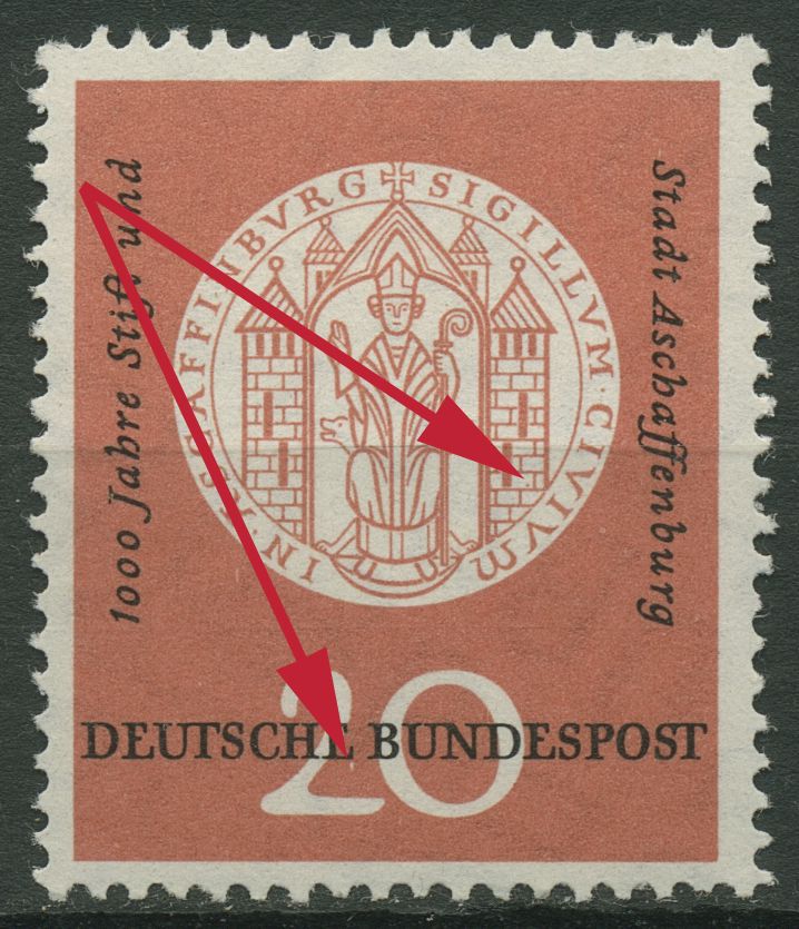 Plattenfehler 255 VI: Punkt rechts neben unterem Fenster im rechten Turm und weißer Fleck unter zweitem E von DEUTSCHE