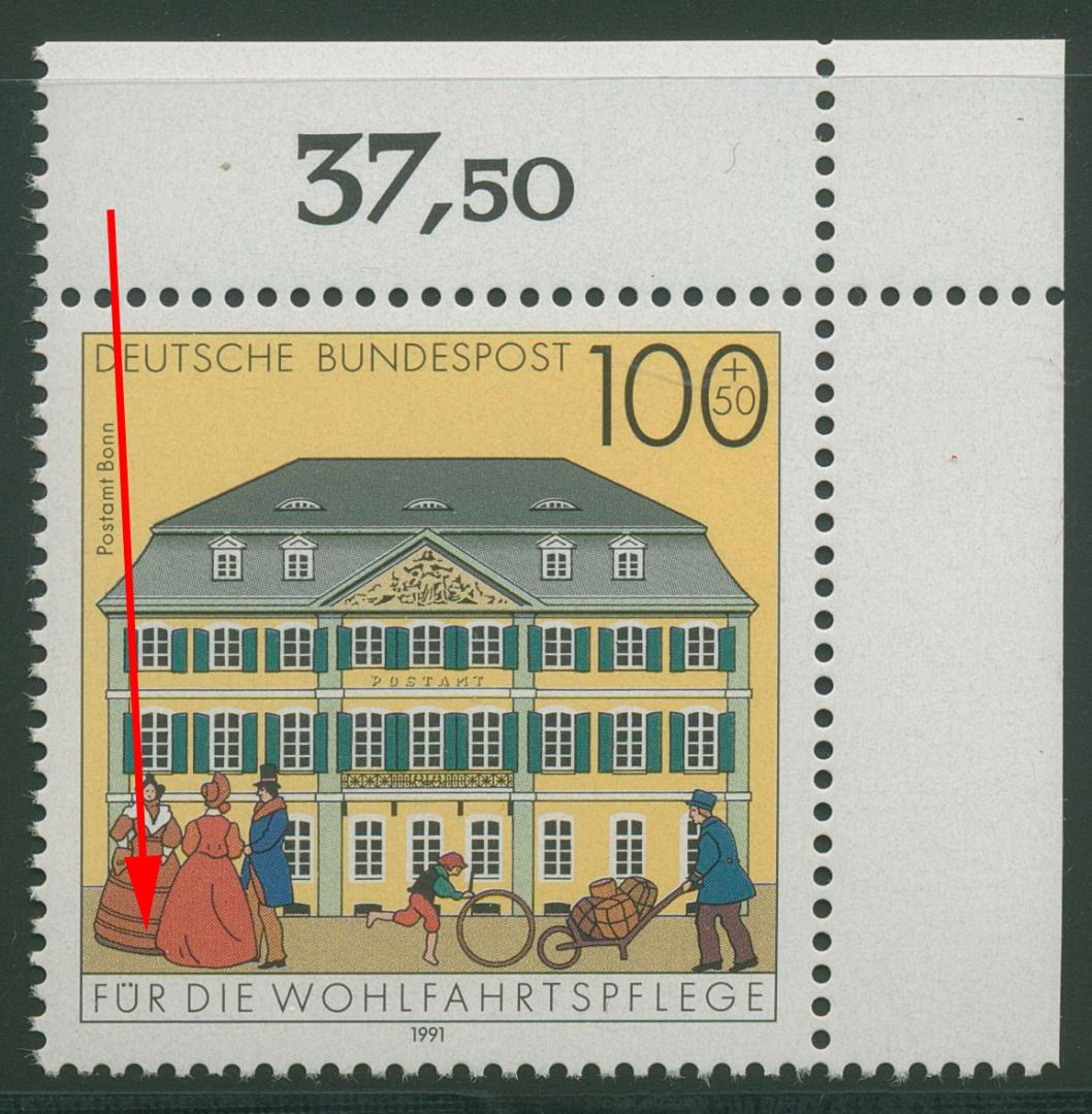 Plattenfehler 1567 f 5 B: Retusche des Plattenfehlers 1567 I (schwarzer Punkt unten im Rock der linken Frau)