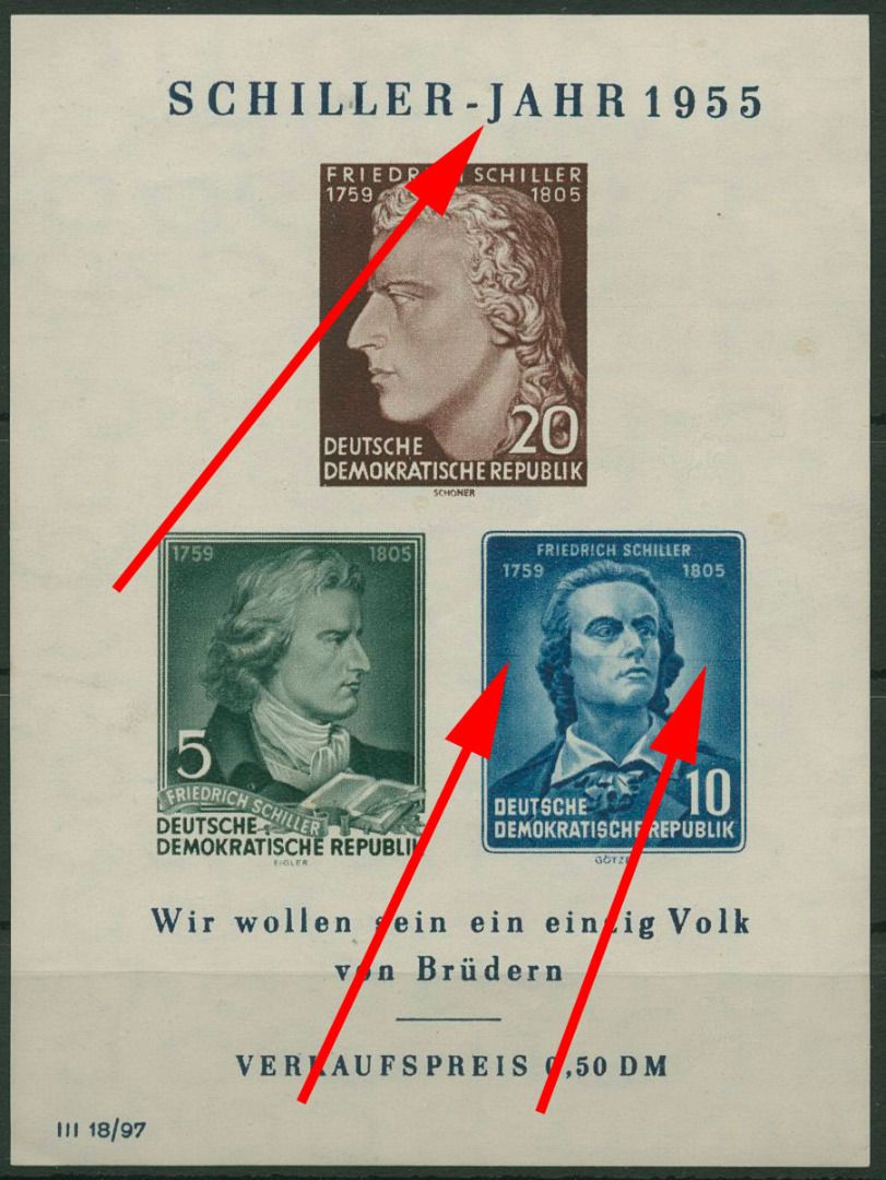 Plattenfehler Block 12 XII PF IX: J von JAHR bei Blockinschrift mit vorgezogenem Fußstrich und waagerechter Strich durch das Markenbild unterhalb der Nase bei Nr. 465 B, Block mit Haftstellen
