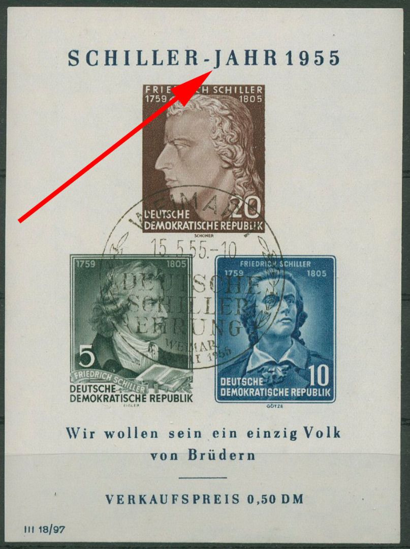 Plattenfehler Block 12 XI PF IV: J von JAHR bei Blockinschrift mit vorgezogenem Fußstrich