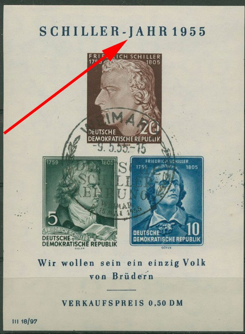 Plattenfehler Block 12 XII PF IV: J von JAHR bei Blockinschrift mit vorgezogenem Fußstrich