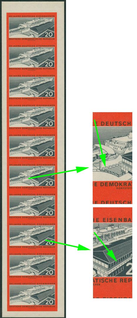 Plattenfehler 805 B F 6: Bruch des zweiten Polders von links und F 8: unten gebogener 4. senkrechter weißer Strich von links, im 2. Stock der Halle, Kat.-Wert: 1050,00