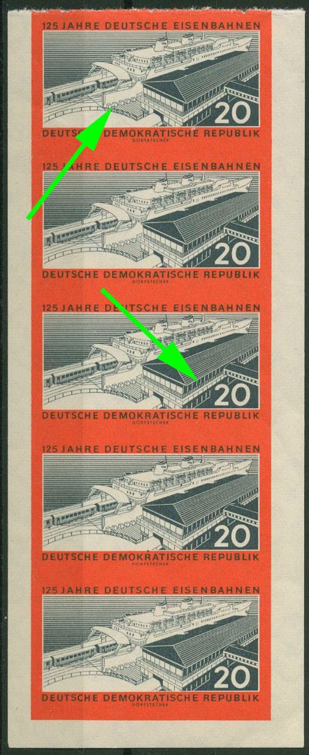 Plattenfehler 805 B F 6: Bruch des zweiten Polders von links und F 8: unten gebogener 4. senkrechter weißer Strich von links, im 2. Stock der Halle