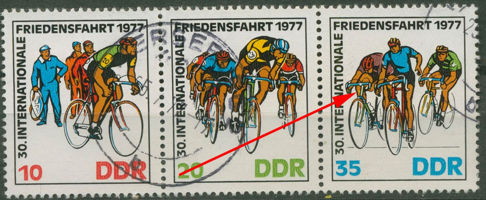 Plattenfehler 2218 F 21: gelber Fleck im Bein des linken Radfahrers