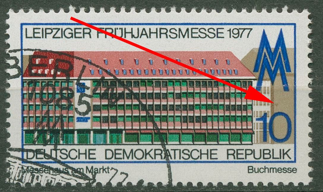 Plattenfehler 2208 F 4: brauner Rasterfleck links über der = der Wertziffer 10