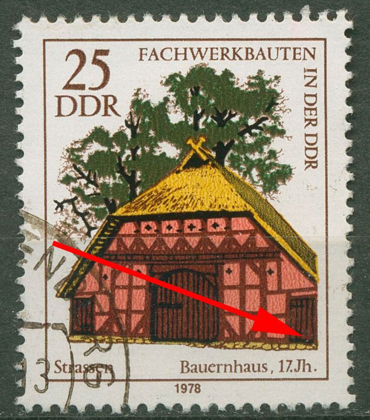 Plattenfehler 2296 F 8: zweiter Strich von rechts im rechten Holztor gebrochen