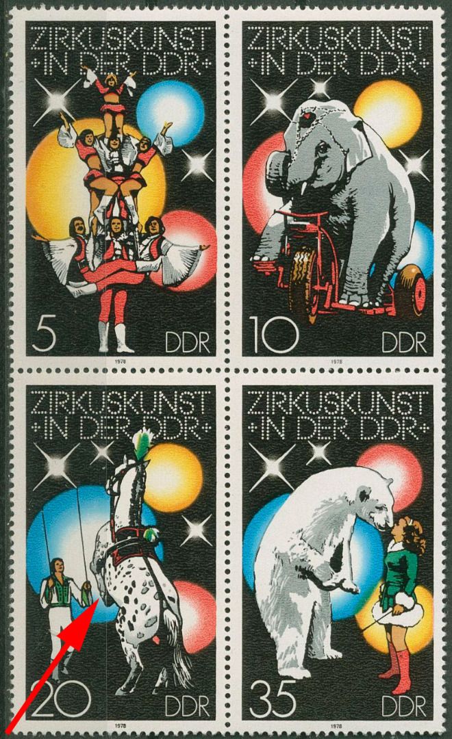 Plattenfehler 2366 F 5 in ZD: schwarzer Punkt im linken vorderen Huf des Pferdes