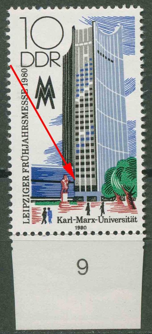 Plattenfehler 2498 F 49: Rasterfleck links unten im Grau des Hochhauses rechts neben dem Denkmal