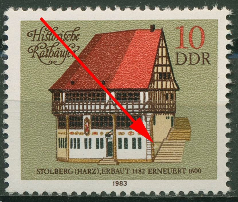 Plattenfehler 2775 F 4: heller Fleck links unten neben der rechten Treppe