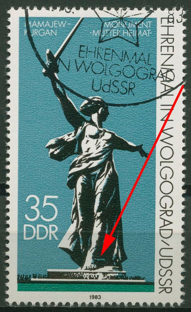 Plattenfehler 2830 F 25: blauer waagerechter Strich rechts am rechten Fuß im Denkmal