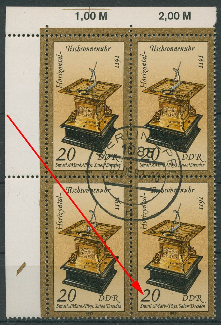 Plattenfehler 2798 F 12: Kerbe in der 2 der Wertangabe 20, 4er-Block mit Vergleichsstück
