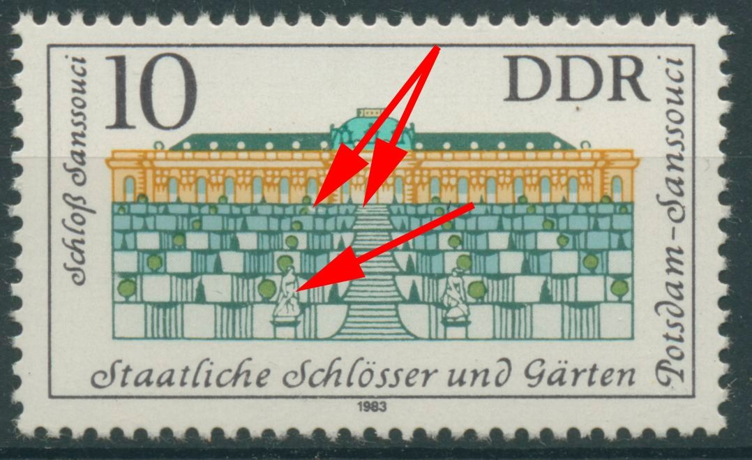 Plattenfehler 2826 F 14: Bruch in der oberen Treppe und weißer Fleck links davon, sowie Bruch in der linken Figur