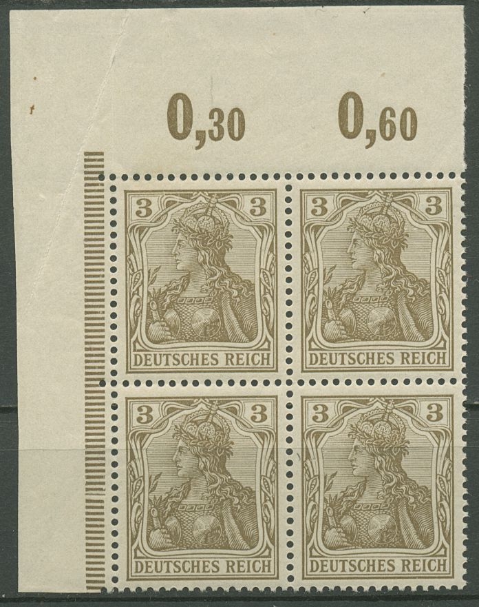 Deutsches Reich 1902 Germania o. WZ Platte 69 a P OR 4er-Block Ecke 1 postfrisch