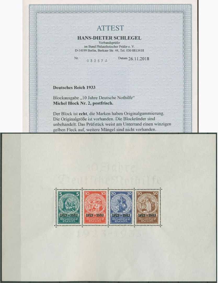 Deutsches Reich 1933 Nothilfe Block 2 postfrisch geprüft mit Fotoattest
