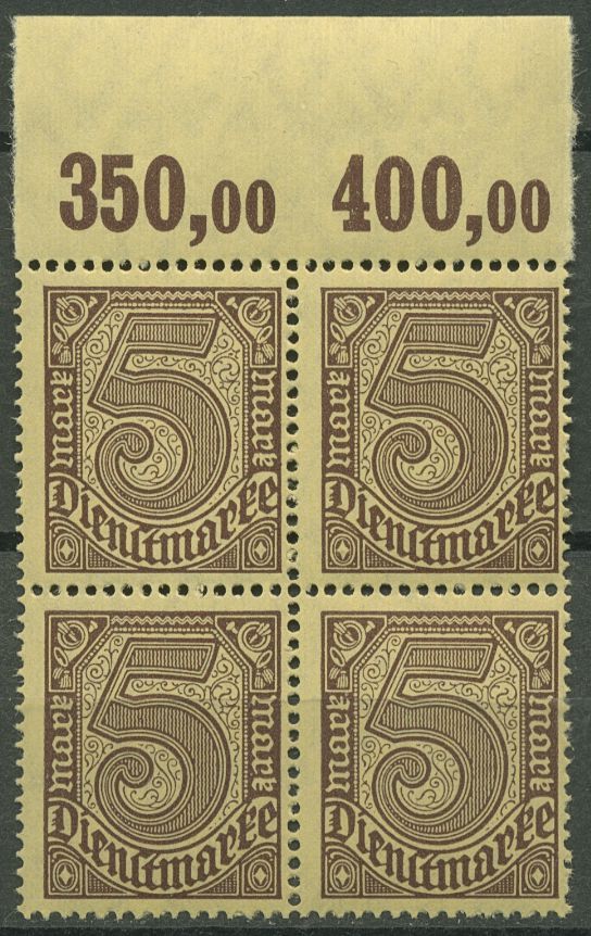 Dt. Reich Dienst 1920 Platte Oberrand D 33 a P OR 4er-Block postfrisch