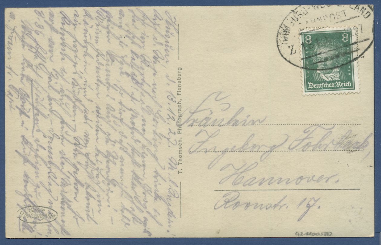 Flensburg Altstadt Hafen Foto, gelaufen 1927 mit Bahnpost Hamburg - Westerland (AK873)