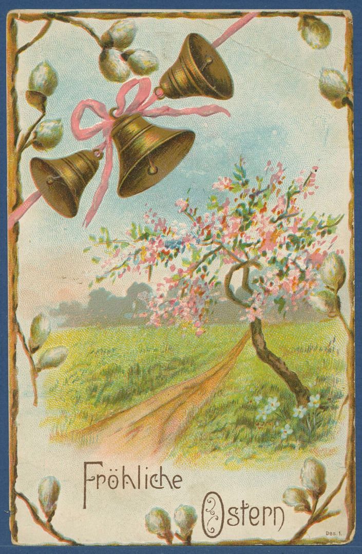 Fröhliche Ostern Glocken Blühender Baum Prägekarte, ungebraucht (AK5612)
