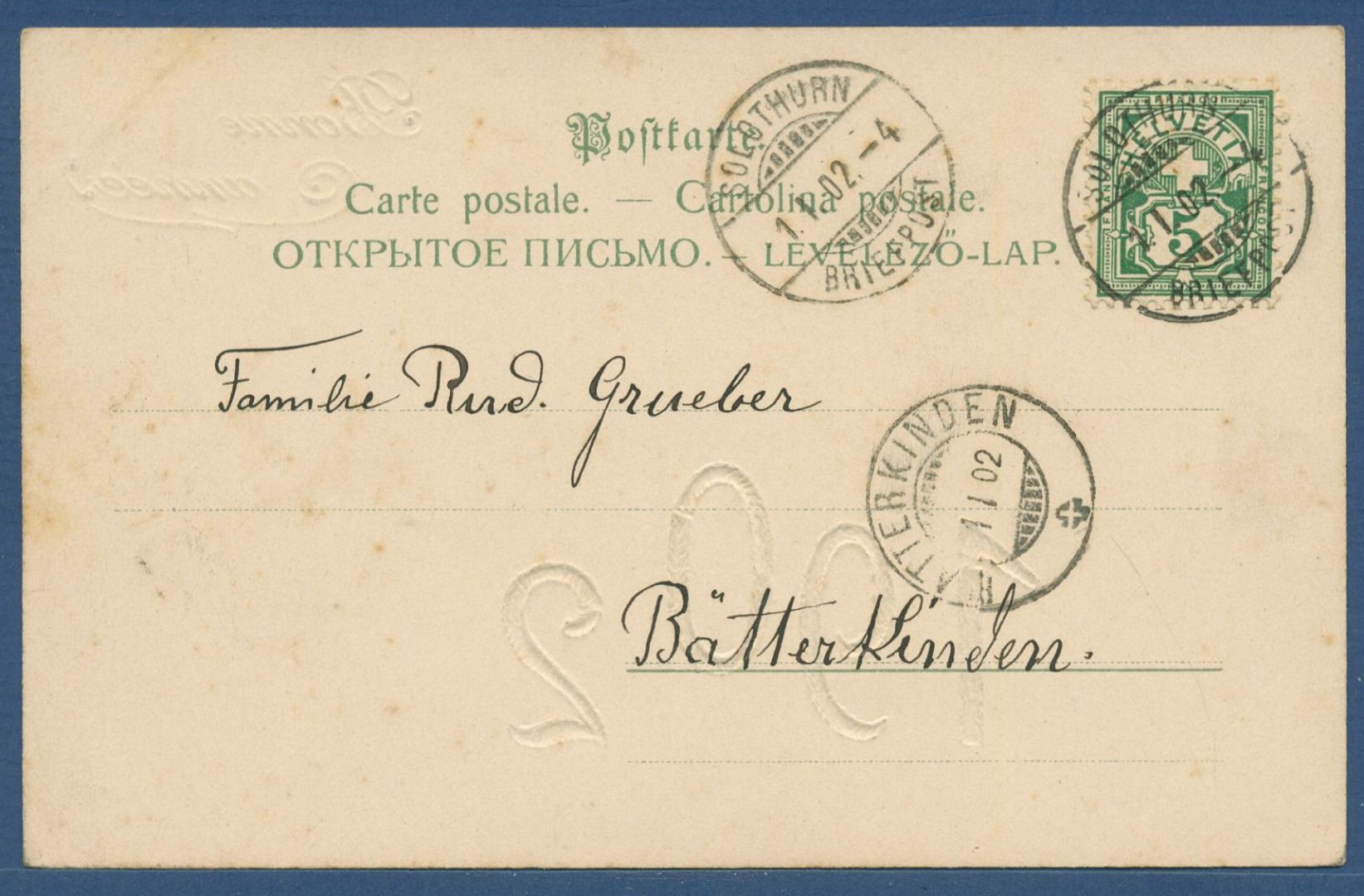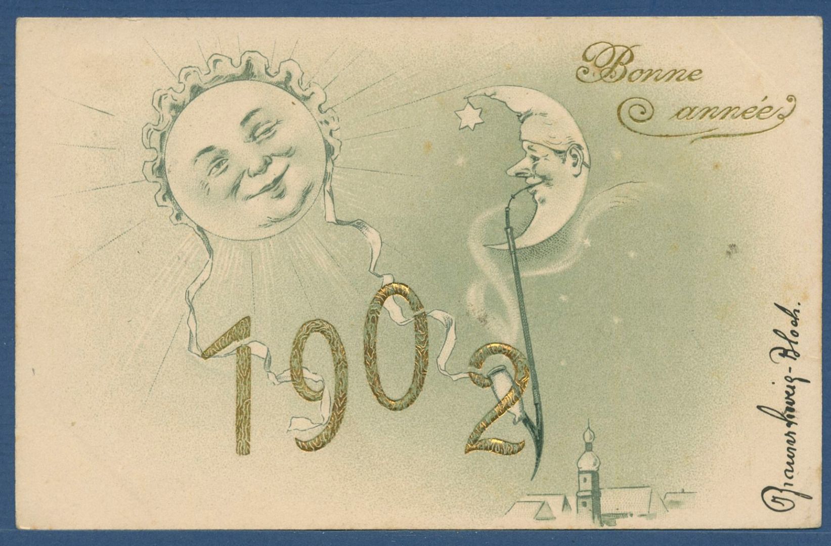 Neujahr Bonne anneé 1902 Sonne und Mond mit Pfeife, gelaufen 1.1.1902 (AK5583)