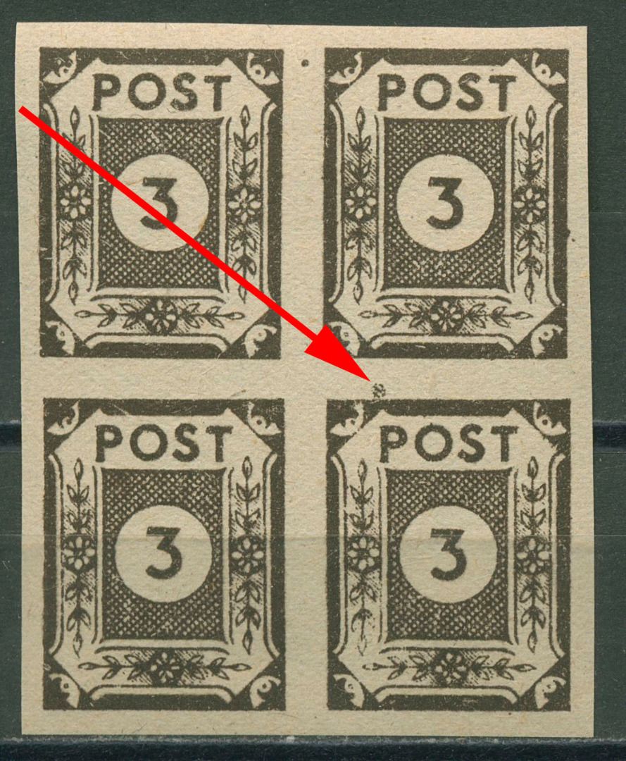 Plattenfehler 51 atx I PF VIII: großer Farbpunkt am Markenrand oben links, 4er-Block mit Vergleichsstück
