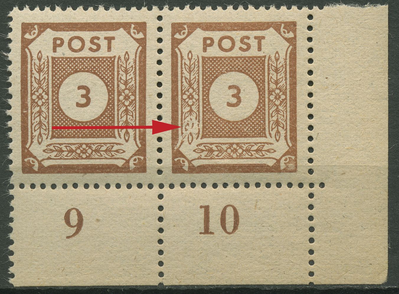 SBZ Ost-Sachsen 1945 Ziffernserie mit Plattenfehler 56 a XII: linke Ranke unten beschädigt, Paar mit Vergleichsstück
