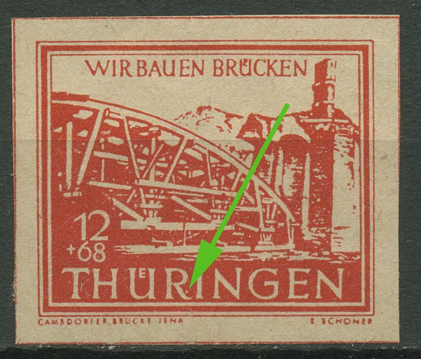 SBZ Thüringen 1946 Wiederaufbau Brücken mit Plattenfehler 113 ay V: Punkt rechts neben R in THÜRINGEN, postfrisch