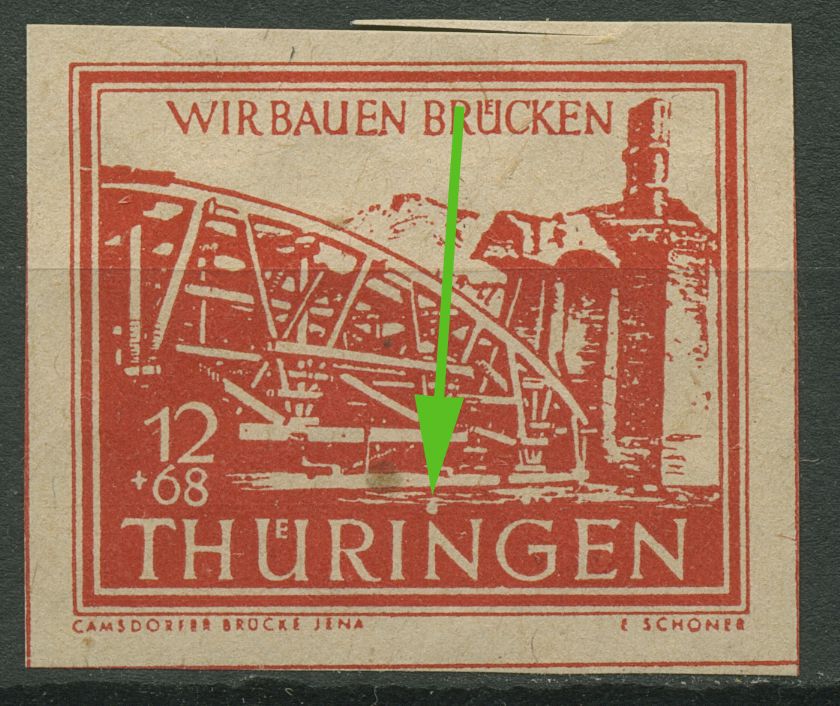 SBZ Thüringen 1946 Wiederaufbau Brücken mit Plattenfehler 113 ay X: großer weißer Punkt über erstem N in THÜRINGEN, postfrisch