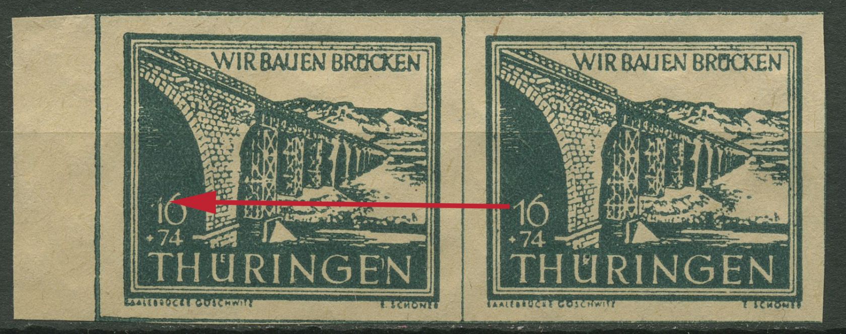 SBZ Thüringen 1946 Wiederaufbau Brücken mit Plattenfehler 114 y IV: Aufstrich der 1 der Wertangabe 16 beschädigt, postfrisch