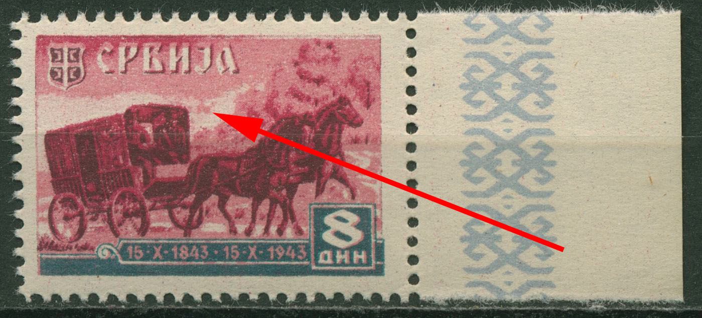 Serbien 1943 100 J. serb. Post mit Plattenfehler 95 II Randstück postfrisch