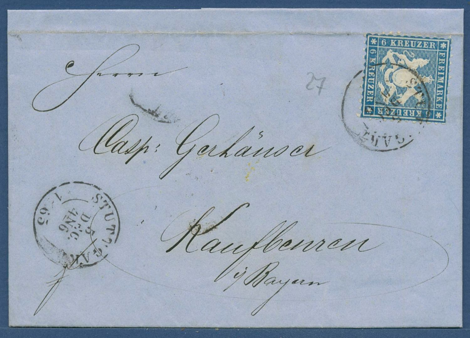 Württemberg Faltbrief mit 6 Kreuzer 27 a, K 2 STUTTGART n. Kaufbeuren (X41523)